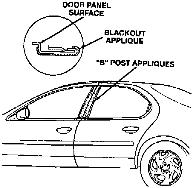 B-pillar appliques are loose or pulled away from the door at the top. This condition is caused by poor adhesion of the retaining tape at the inside top edge of the applique. Vehicles with loose appliques should have the repair procedure performed.