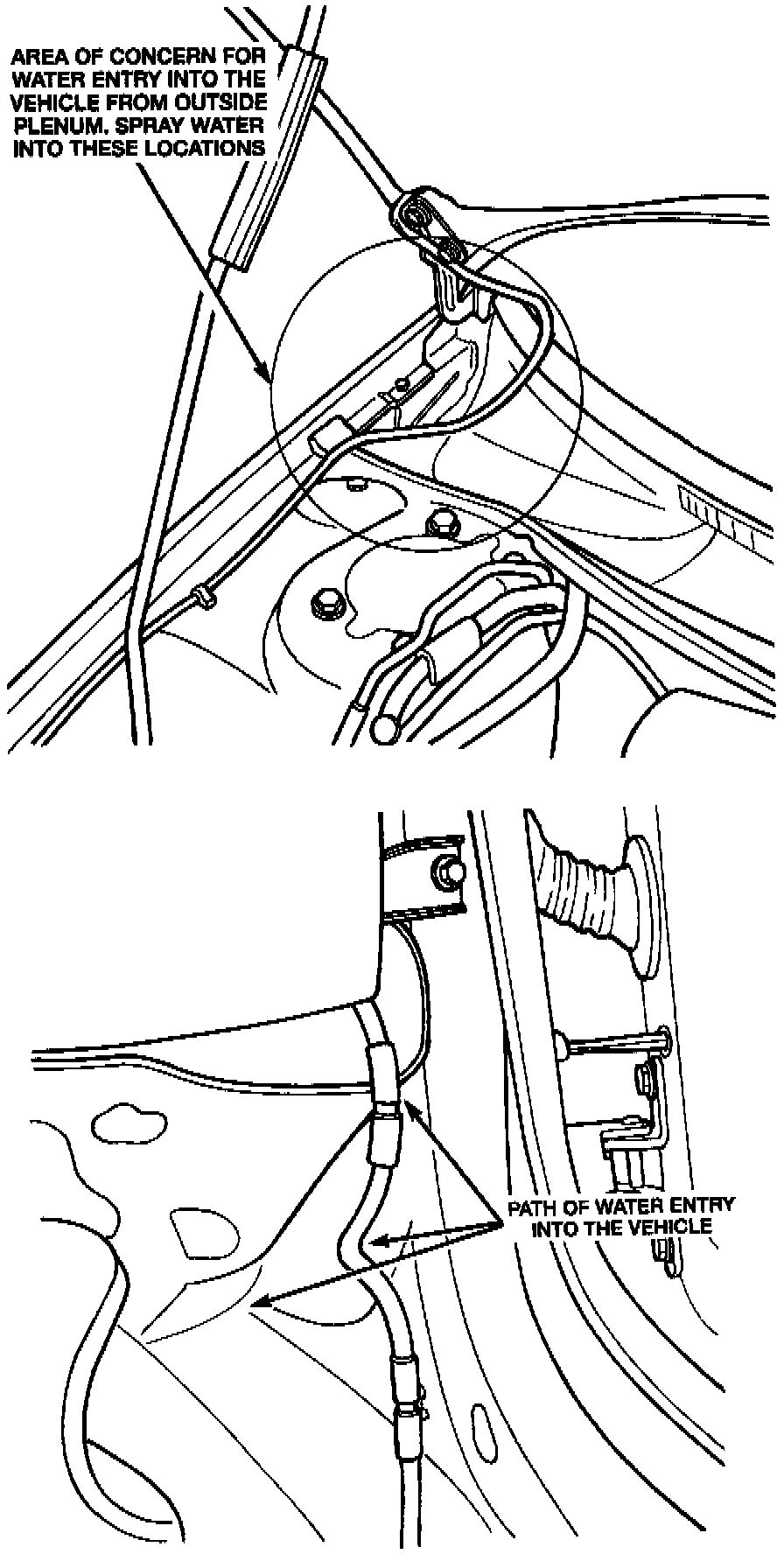 If carpet or dash silencer pad are damp, confirm that the water is entering the vehicle through the outside plenum. Remove the windshield wipers and cowl cover. Raise the hood and spray water at the base of the left and right A-pillar into the cowl side/plenum floor area seams and up into the A-pillar/cowl baffle. In addition, spray water around the hood hinge relief pocket, hood hinge tap plate and load beam baffle attachment push pin (push pin is located just below the hood hinge tap plate). While spraying water into the areas listed, have the carpet and dash silencer pad raised off the floor and check for water entering the vehicle.