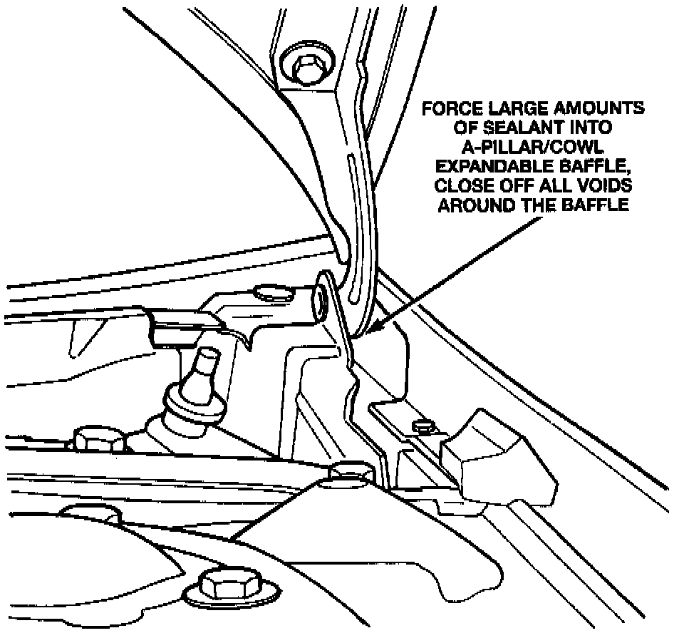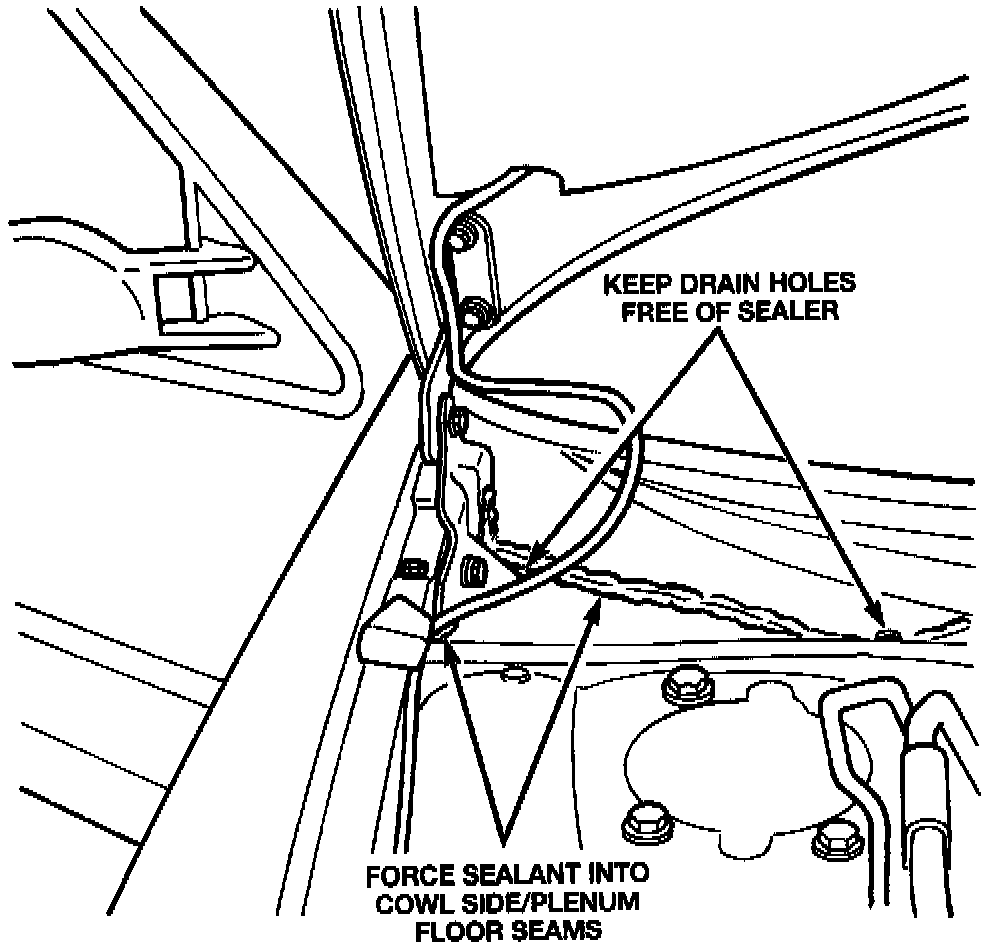 3. Force Mopar Silicone Rubber Adhesive Sealer, P/N 4318025, as far as possible into the cowl side/plenum floor seams. Care must be taken not to close off the plenum water drain holes. Force a large amount of sealant up into the area of the A-pillar/cowl baffle. It may be necessary to completely cover the A-pillar/cowl baffle with sealant to be sure to close off all voids around the baffle.