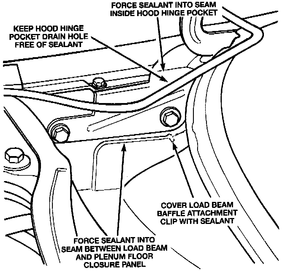 2. The cowl side/plenum floor seams, hood hinge relief pocket, hood hinge tap plate and inner load beam at the load beam baffle attachment push pin must be free from dirt, grease and other contaminants. Clean these areas with Mopar Super Kleen, P/N 4318015, and compressed air.