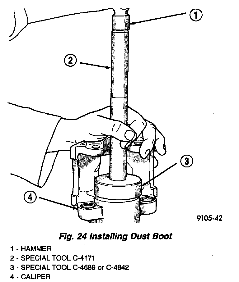 20. Using a hammer and piston caliper boot installer tool No. C-4689 and handle tool No. C-4171, or their equivalents, drive boot into counterbore of the caliper.