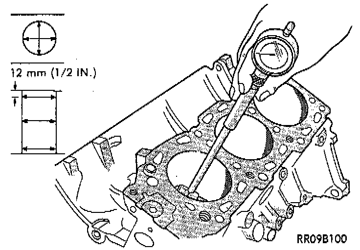 1. Examine cylinder walls for scuffs, scoring and measure cylinder bore for out-of-round or taper. Measure at points shown.