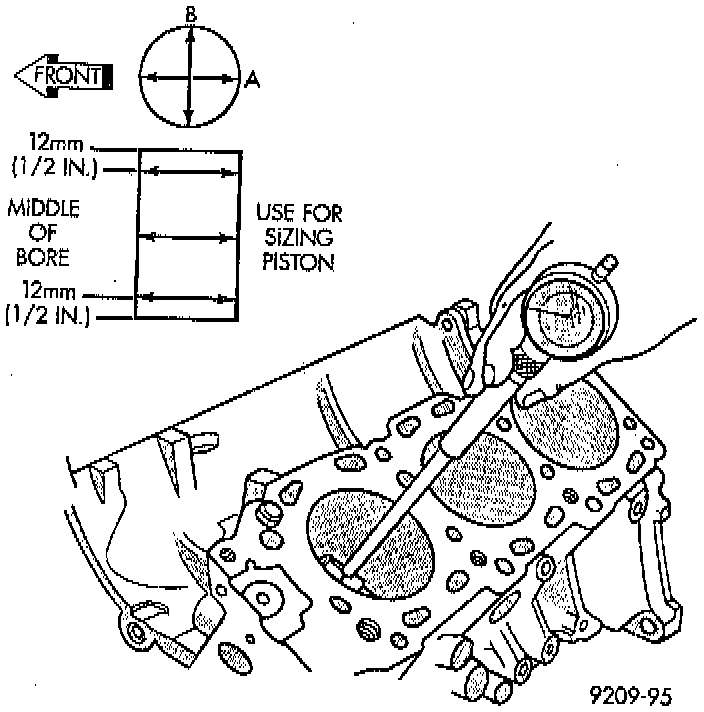 1. Measure the cylinder bore at three levels in directions A and B. Top measurement should be 12mm (0.50 inch) down and bottom measurement should be 10mm (0.38 inch) up.