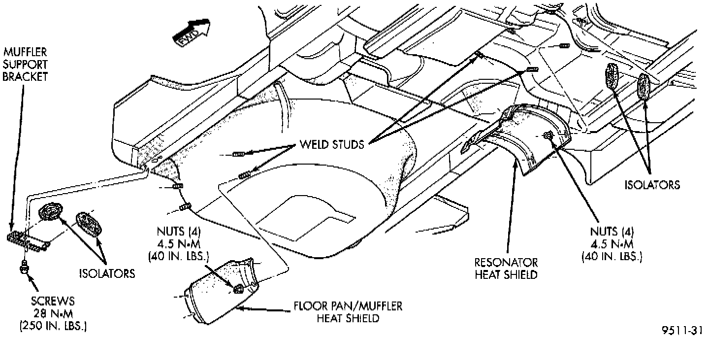 Avoid application of rust prevention compounds or undercoating materials to exhaust system floor pan heat shields on cars so equipped. Light over spray near the edges is permitted. Application of coating will greatly reduce the efficiency of the heat shields resulting in excessive floor pan temperatures and objectionable fumes.