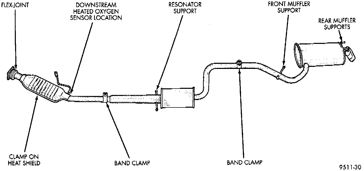 When assembling exhaust system do not tighten clamps until components are aligned and supports have equal load on them.