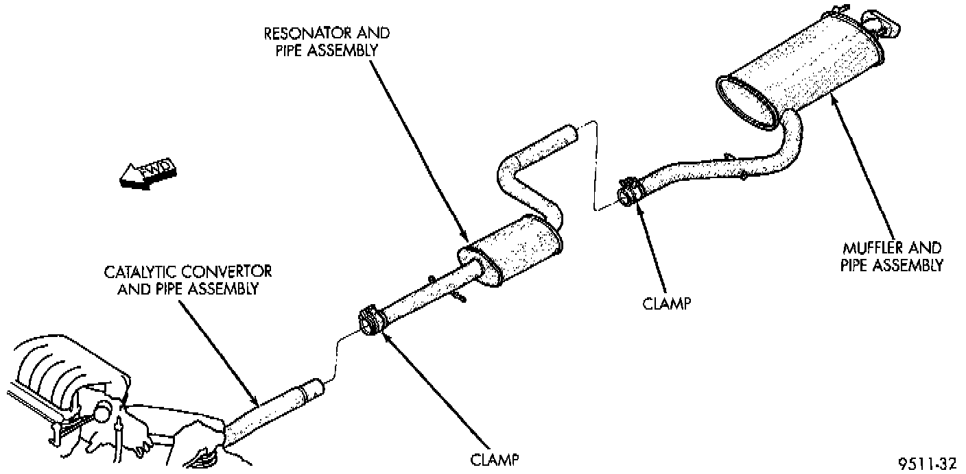 2. Remove clamp and supports at muffler to resonator assembly. Remove muffler from resonator pipe.