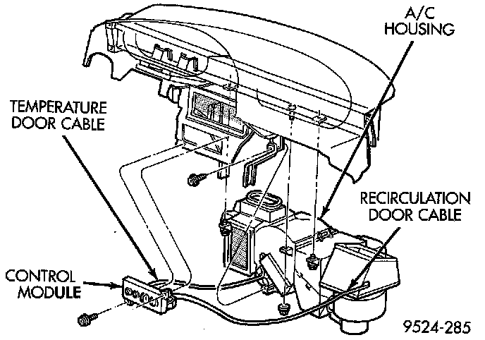 8. Release the recirculation cable retaining clip from the top of the control module. Retain the clip for future use. Then disconnect the recirculation control cable.