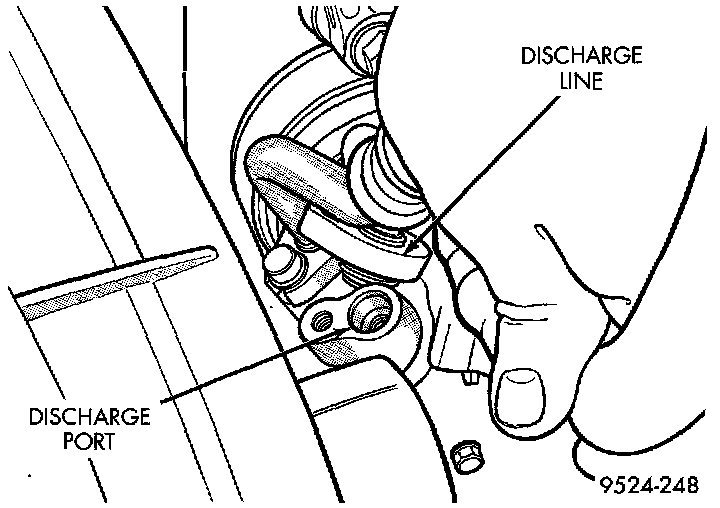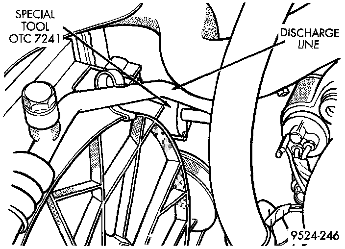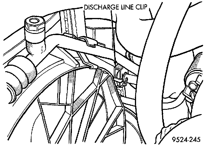 4. Disconnect line at A/C compressor. Remove discharge line.