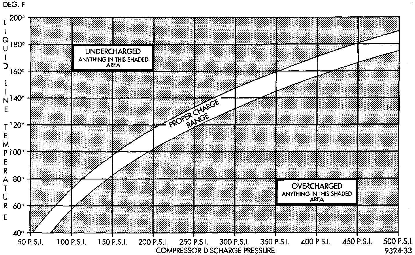 6. Observe Discharge pressure and Liquid line temperature. Using the Charge Determination Graph determine where the system is currently operating. If the system is in the undercharged region, ADD 0.057 Kg. (2 oz.) to the system and recheck readings. If the system is in the overcharged region, RECLAIM 0.057 Kg. (2 oz.) from the system and recheck readings. Continue this process until the system readings are in the proper charge area on the Charge Determination Chart.