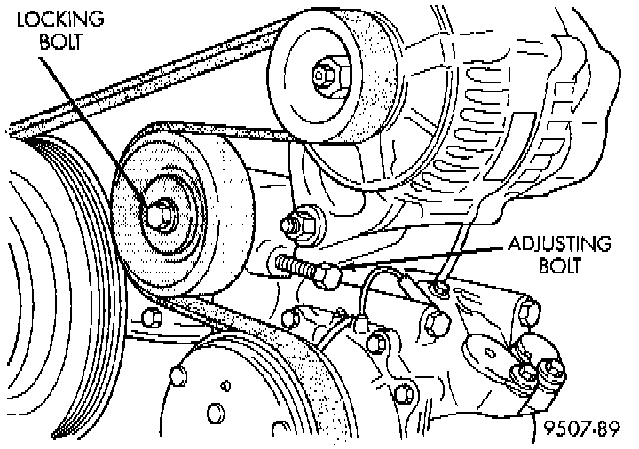 To remove and install the air conditioning compressor and generator drive belt, first loosen the idler pulley lock bolt, then turn the adjusting screw to increase or decrease the idler pulley tension. To adjust the air conditioning and generator drive belt, loosen the idler pulley bolt and adjust belt tension by turning adjusting screw. Tighten pulley bolt to 54 Nm (40 ft. lbs.) after adjustment.