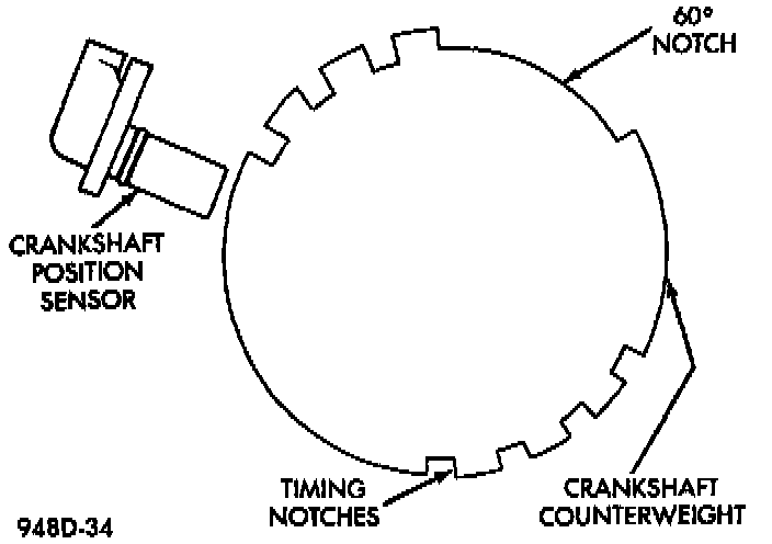 The second crankshaft counterweight has two sets of four timing reference notches including a 60 degree signature notch Fig. 9. From the crankshaft position sensor input the PCM determines engine speed and crankshaft angle (position).