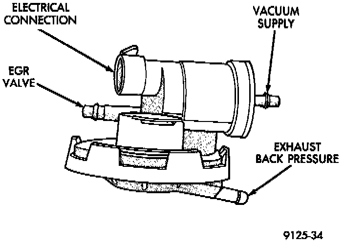 The Electric EGR Transducer contains an electrically operated solenoid and a back-pressure controlled vacuum transducer Fig. 27. The PCM operates the solenoid based on inputs from the multi-port fuel injection system. The solenoid/transducer and EGR valve are serviced as an assembly.