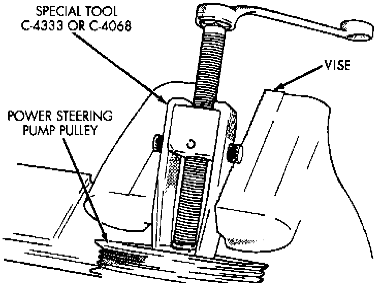 2. Place power steering pump in a vise while using puller tool No. C-4333, or C-4068, or equivalents, to remove pulley. Ensure pump shaft does not turn.