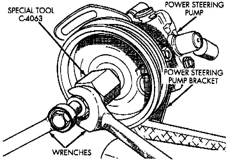 d. Place installer tool No. C-4063B, or equivalent, in internal threads of power steering pump shaft and against spacer on power steering pump pulley.