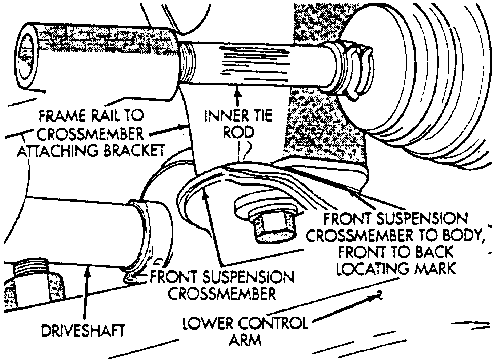 8. Using an awl, scribe a line on front suspension crossmember marking side to side installed location where front suspension crossmember is mounted against body on both sides of vehicle.