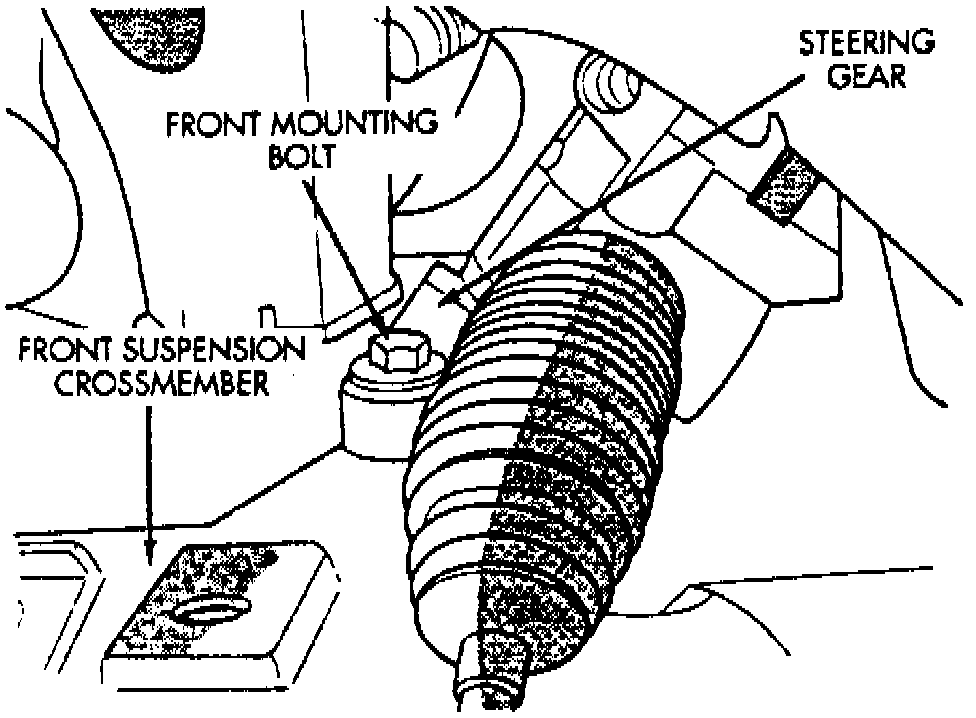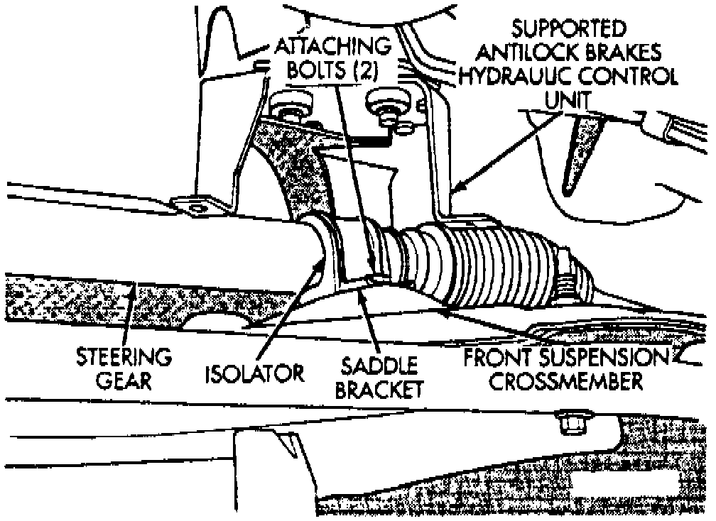 18. Remove two bolts at isolators attaching steering gear assembly to front suspension crossmember, then the two bolts attaching steering gear saddle bracket to front suspension crossmember.