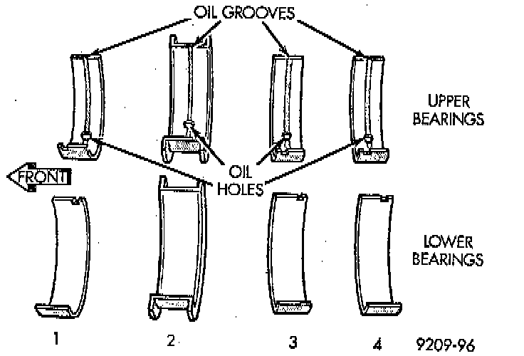 Bearing caps are not interchangeable and should be marked at removal to insure correct assembly. Upper and lower bearing halves are NOT interchangeable. Lower main bearing halves of 1, 3 and 4 are interchangeable. Upper main bearing halves of 1, 3 and 4 are interchangeable.