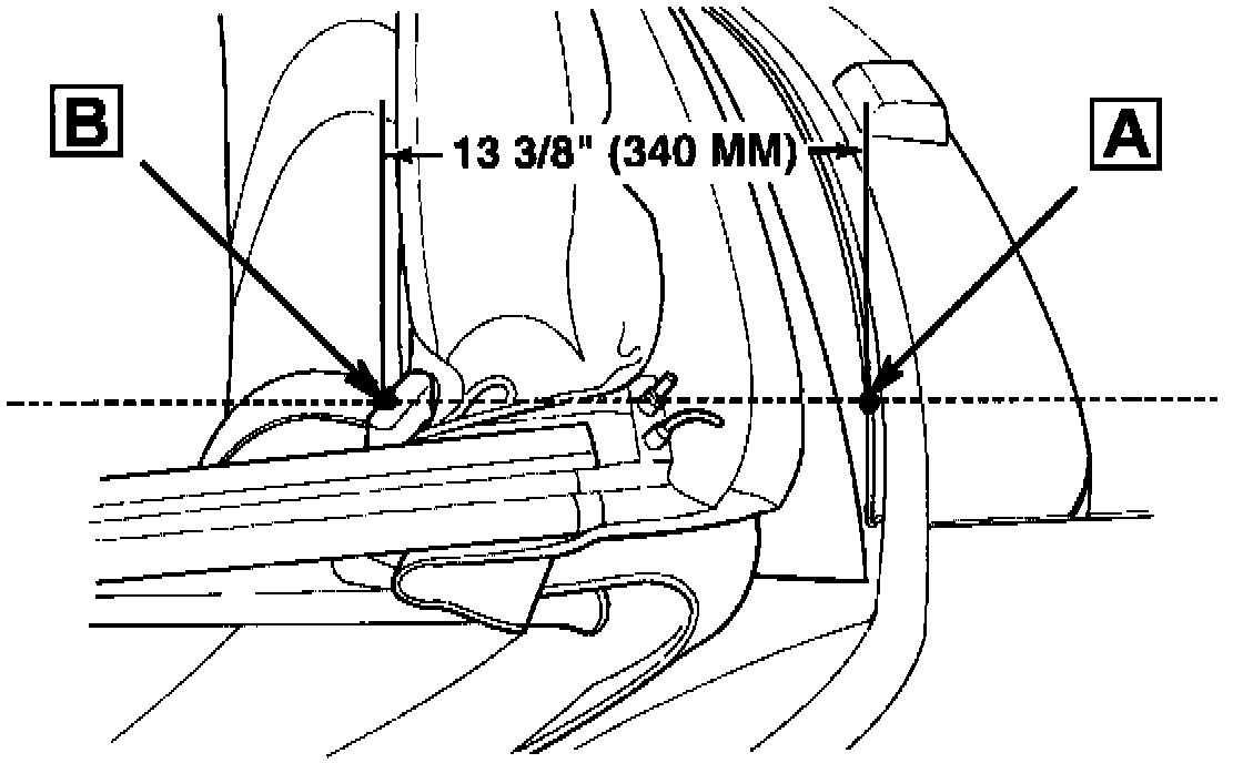 2. Using a tape measure, hook the end in the rear attachment channel at Point A and extend the tape measure through the center of the top front edge of the rear seat shoulder belt tower at Point B, maintaining the tape parallel to the center line of the vehicle. Record the measurement. Perform the same measurement on the opposite side and record the measurement. See Illustration.
