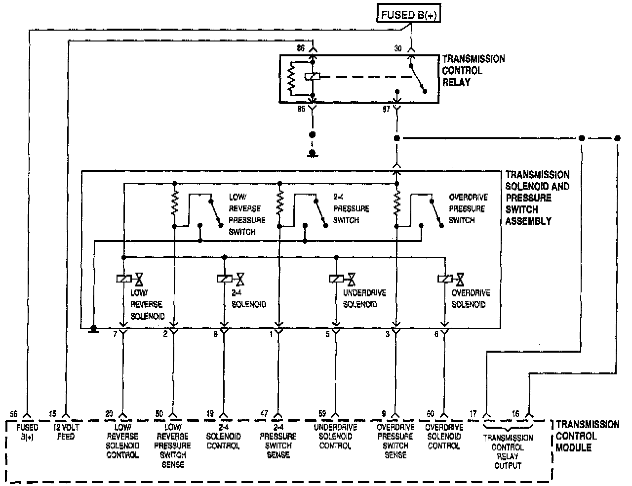 - Pressure switch sense circuit shorted to battery between TCM and solenoid pack