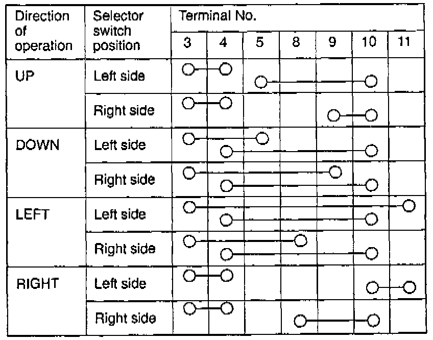 Check the continuity of the door mirror switch according to the chart above and replace the switch if it does not operate properly.
