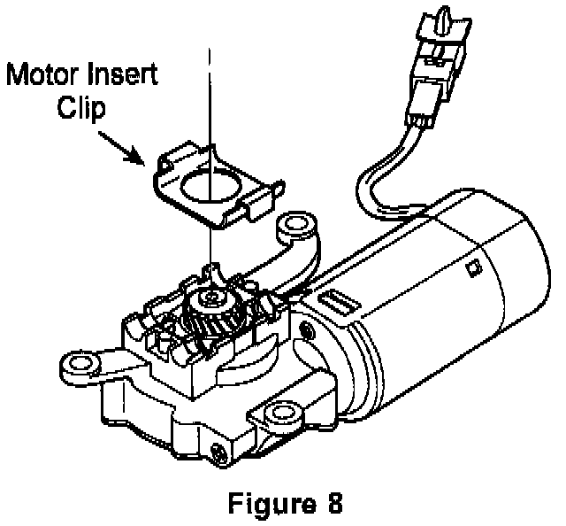 17. Manually move the sunroof guide assemblies to the full closed position. Install the drive motor. Make sure the motor insert clip (located on motor) has not fallen off (Figure 8). A missing clip will result in motor ratcheting jerky sunroof operation or drive cable to gear disengagement.