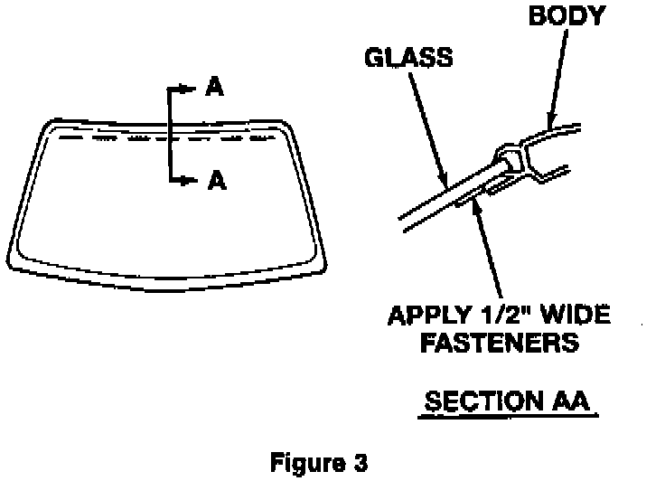 5. **Use the less dense strip (# 3552) from the "3M Dual Lock Kit 6484n, and cut seven 6" long strips, 1/2" wide. Apply these to the top edge of the windshield. Butt the strips to the bottom of the sheet metal flange. The strips should not extend beyond the black out line of the windshield (Figure 3). **