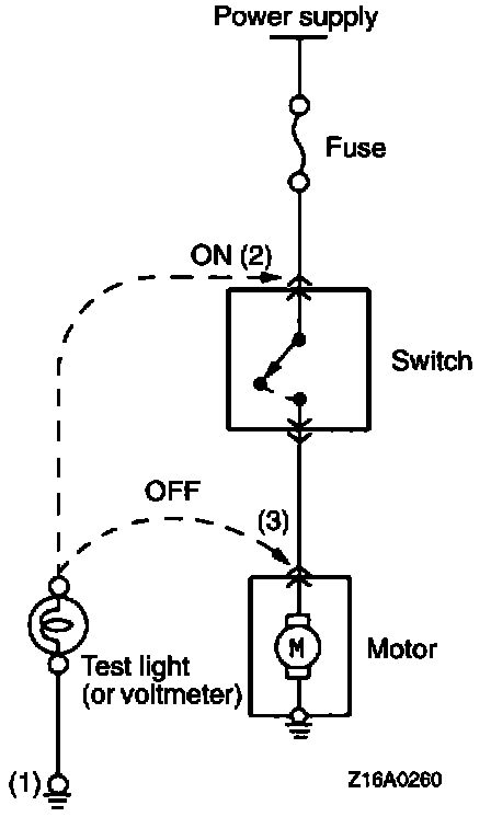 1. Ground one lead wire of the test light. If a voltmeter is used instead of the test light, ground the grounding side lead wire.
