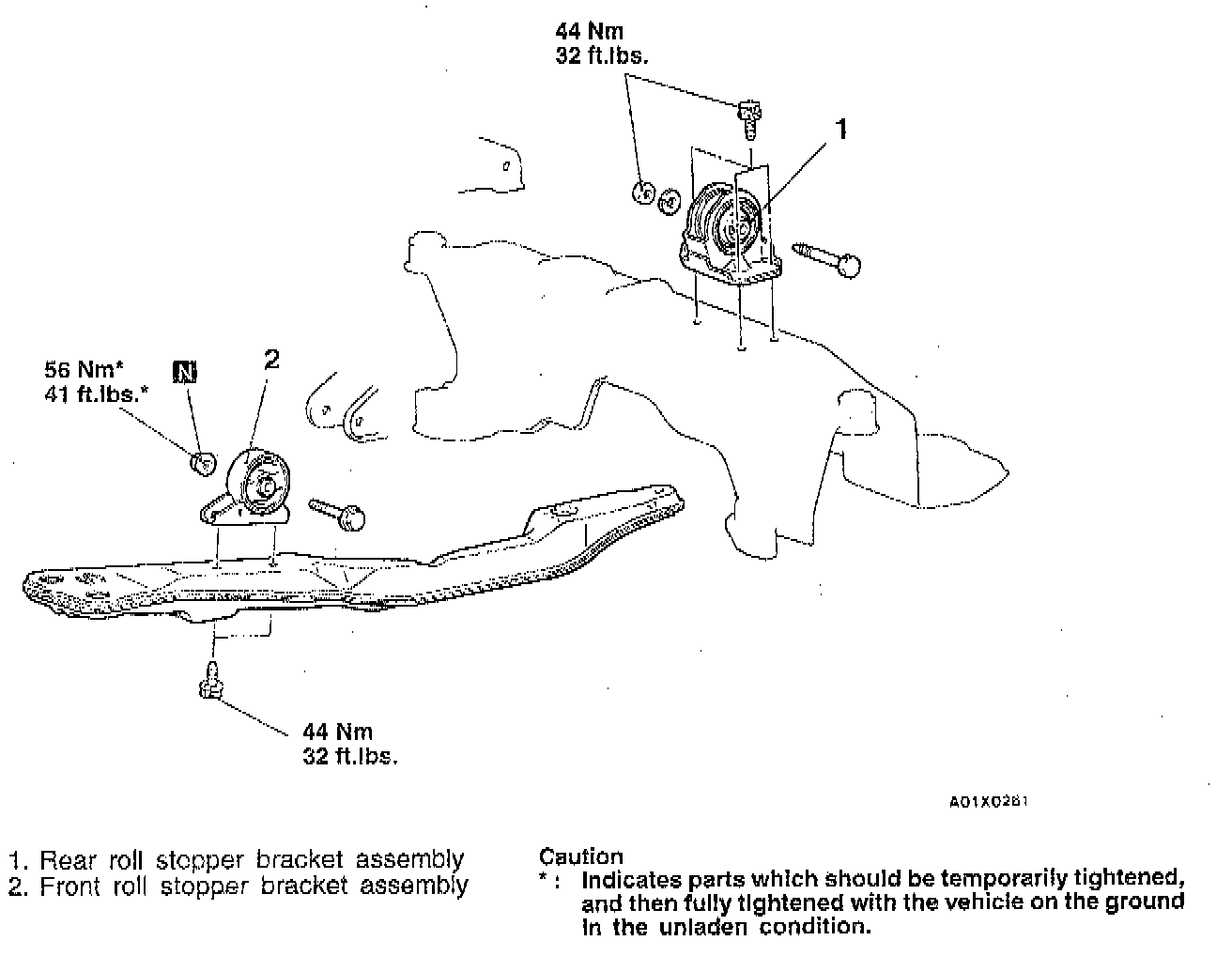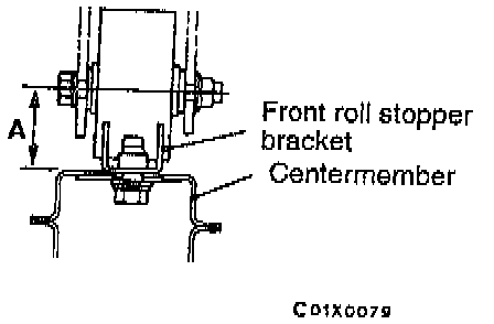 2. If the dimension (A) shown in the illustration is outside the 43 ±3 mm (1.69 ±0.12 inch) when the weight of the engine is on the body, replace the front roll stopper bracket assembly.