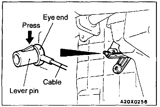 1. Press the lever pin to disconnect the air outlet changeover damper cable.