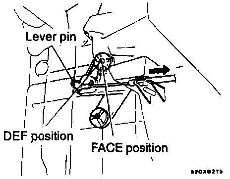 6. Set the air outlet changeover damper lever of the heater unit to DEF position and install the cable to the lever pin.