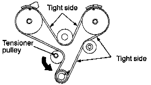(3) Apply force counterclockwise to the camshaft sprocket on the rear side. When the tight side of the belt is taut, check that the timing marks are all aligned.