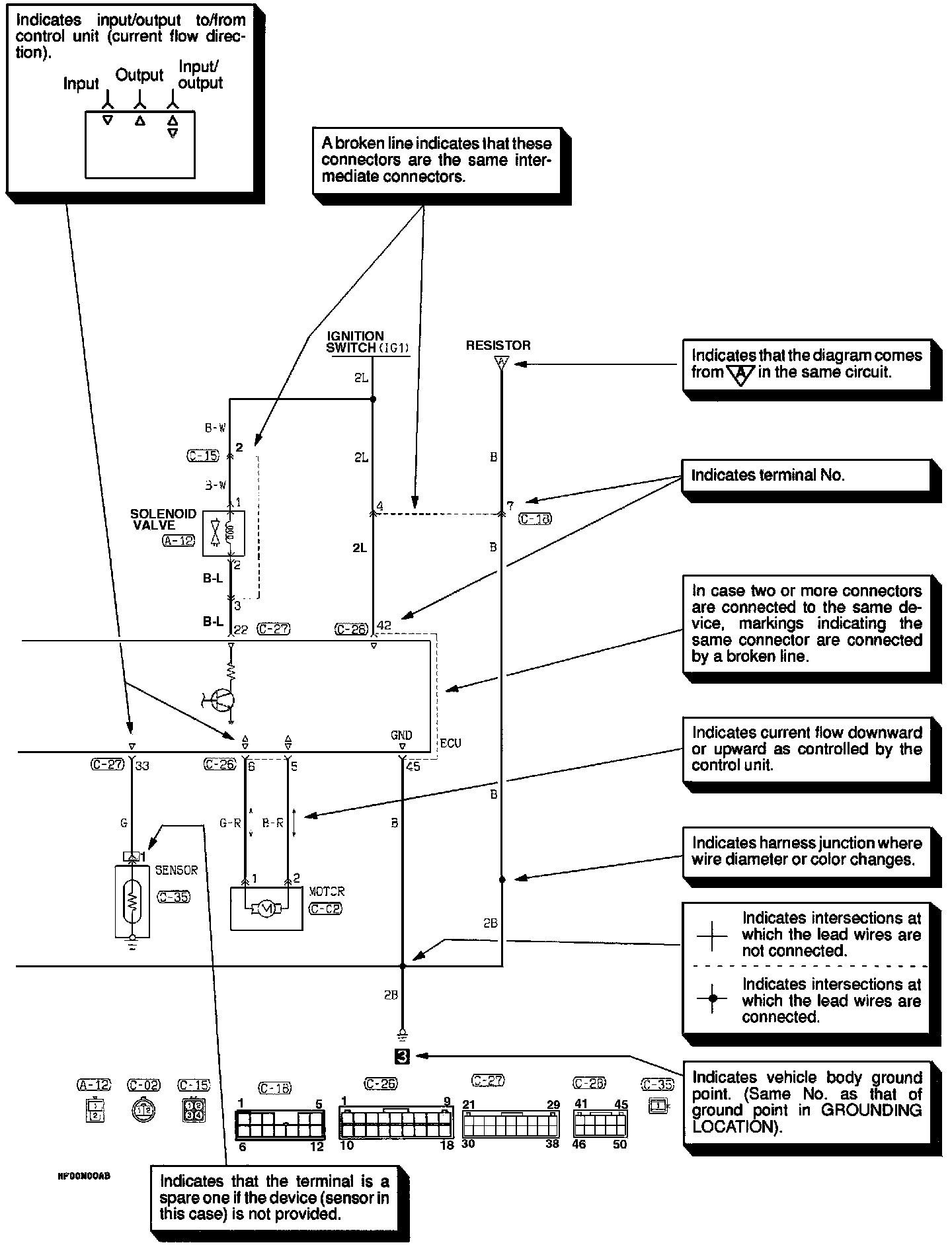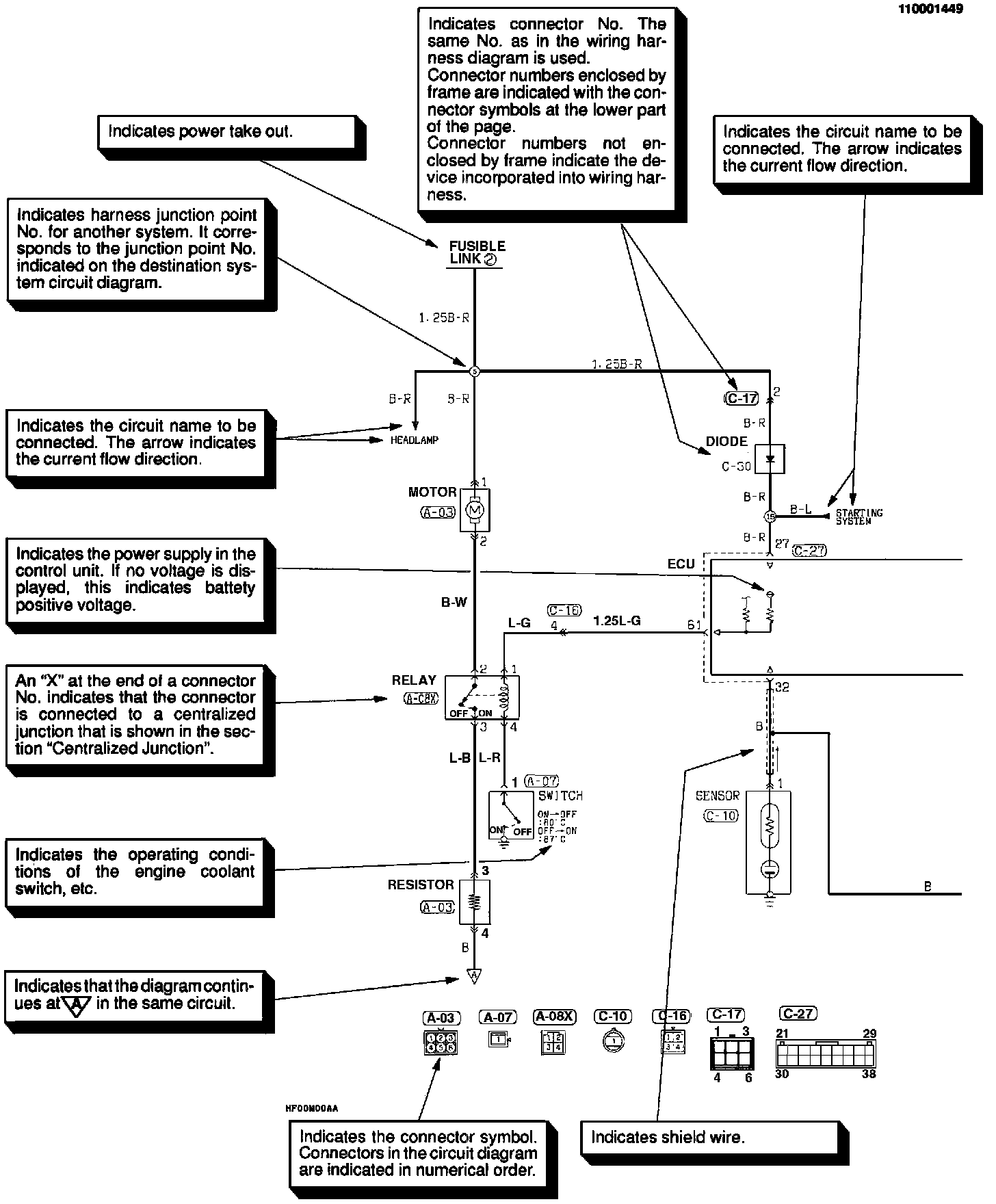 The circuit of each system from the fuse (or fusible link) to ground is shown. The power supply is shown at the top and the ground at the bottom to facilitate understanding of how the current flows.