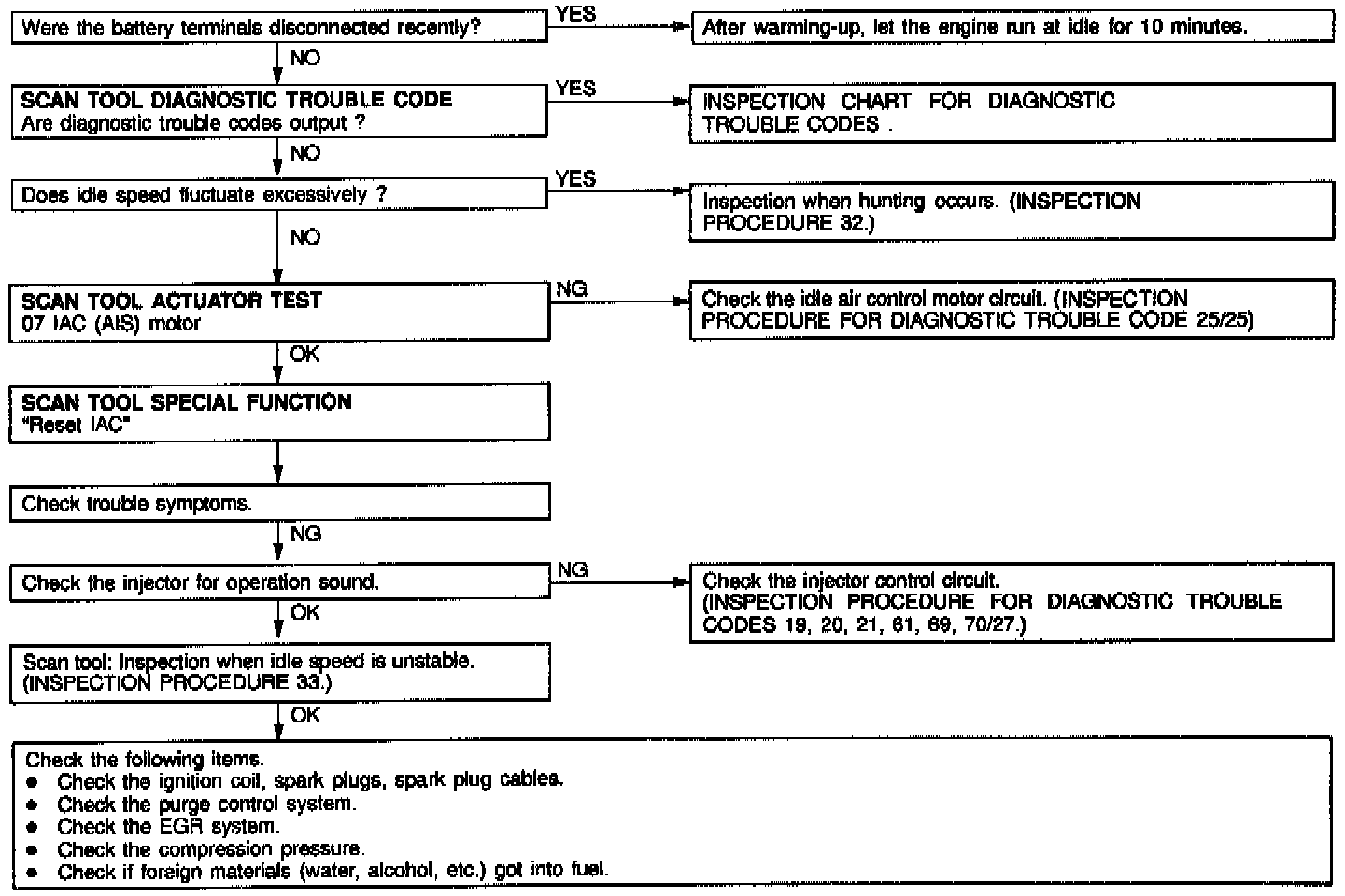 - In oases such as the above, the cause is probably that the ignition system, air/fuel mixture, idle air control motor or compression pressure is defective