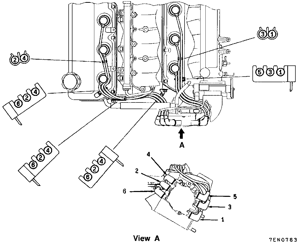 2. The numerals on the support and clamp indicate the spark plug cable No.