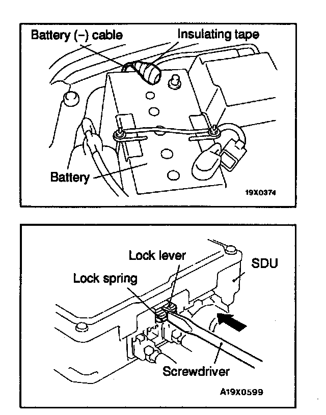 1. Turn the ignition key to the "LOCK" position, disconnect the negative battery cable and tape the terminal.