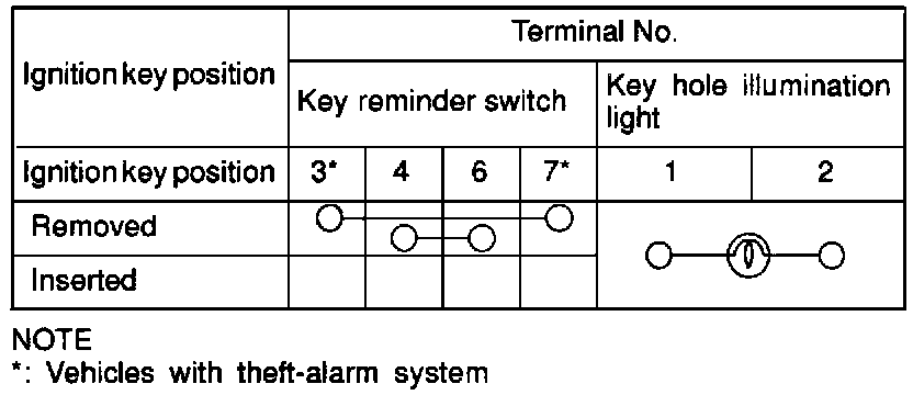 Key Reminder Switch, Key Hole Illumination Light Continuity Check Table: