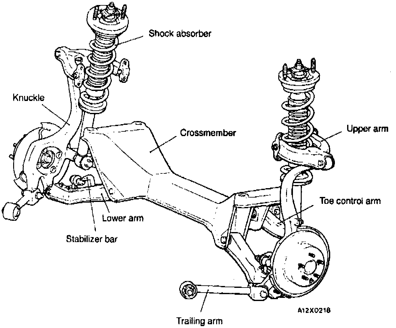 The rear suspension is a modified double-wishbone design with coil springs and direct acting shock absorbers. The rear axle consists of a knuckle, rear hub, unit bearing and axle shaft. The unit bearing is press-fitted to the rear axle shaft and bolted to the knuckle. On models equipped with ABS, a rotor for detecting vehicle speed is located on the axle shaft and a speed sensor is located on the knuckle.