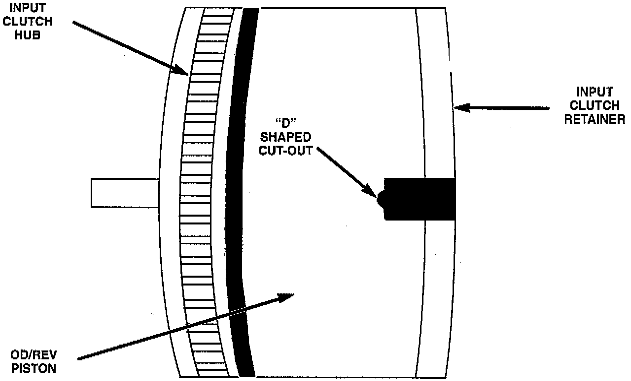 For the 1995 model year the bottom of the OD/Rev piston slots where the OD/Rev pressure plate fits has a "D" shaped cutout. This was done to allow better oil flow and reduce powdery debris build - up that could affect lip seal function.