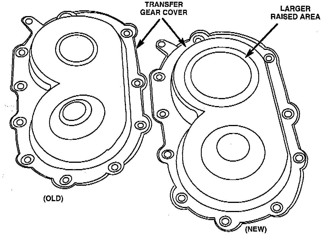 The outside contour of the differential cover was revised for added vehicle clearance (July 1993 for 1994). A differential gear cover was revised for the 1995 model year in preparation for the rear mount, and also the wiring tab was moved to provide additional clearance for the new Minivans. The part numbers for the differential cover below reflect the 1995 model year. The transfer gear cover has been raised to accept the stirrup and strap retainer for the output bolt. The transfer gear cover outside contour and the gear pockets have been revised to accommodate new axle shafts and new ratio transfer gears on future models. The new covers service the old.