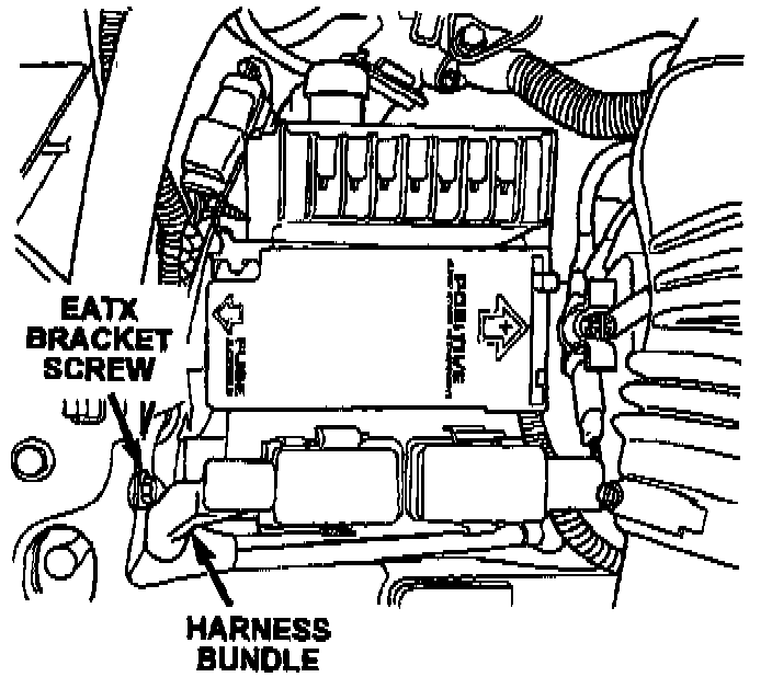 Inspect the headlamp and dash harness section connected to the forward connector of the SBEC (pins 41-80) for fraying after rubbing against the screw head. The screw connects the EATX bracket to the left headlamp mount by way of a brace. See Illustration.