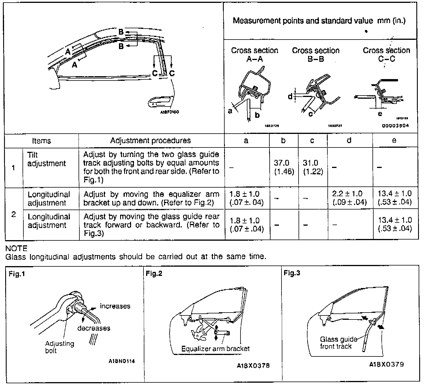 10. Open and close the door and raise and lower the window glass and check the glass installation against the following points.
