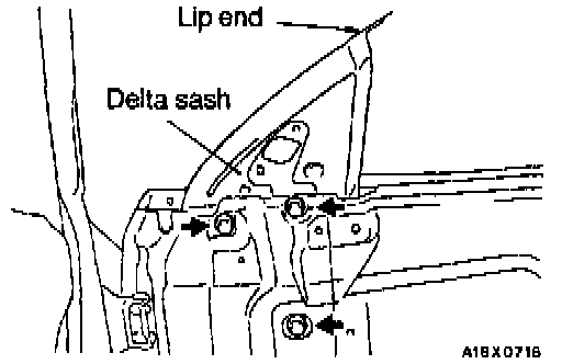 8. Tighten the three delta sash mounting bolts so that the edges of the delta sash and window glass run on smoothly with there being no difference in height at the lip end.