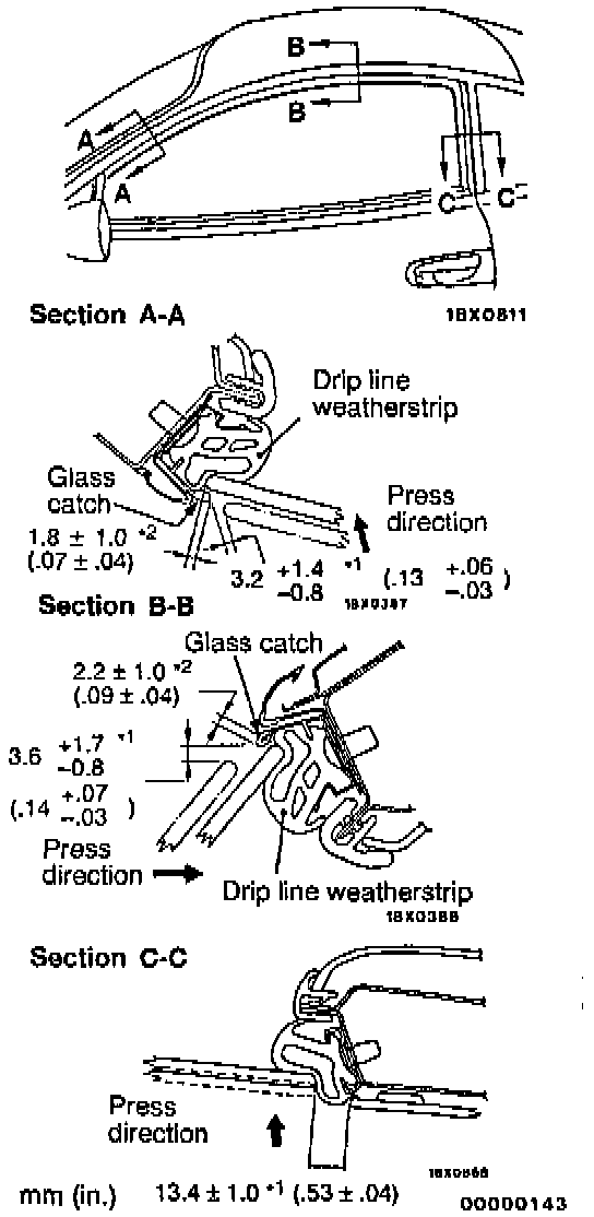 b. The amount of catch of the door catch on the door glass and the amount of step between the door glass and the weatherstrip should be at the dimensions marked by *2 under the following conditions: when the door is closed and then the window is closed fully when the window is closed fully and then the door is closed