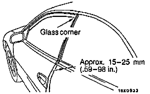 e. Check the amount of glass tilt by the following procedure. Close the door glass fully and then gently close the door. Check that the difference in height between the door and side panels is 15-25 mm (0.59-0.98 in.) when the corner of the door glass is touching the weatherstrip at the top of the center pillar.