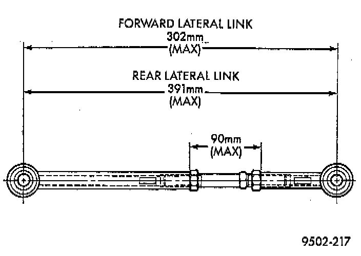 - When setting rear Camber and Toe on the vehicle, the maximum lengths of the adjustable lateral link at the locations shown must not be exceeded. If these maximum lengths are exceeded, inadequate retention of adjustment link to the inner and outer link may result.