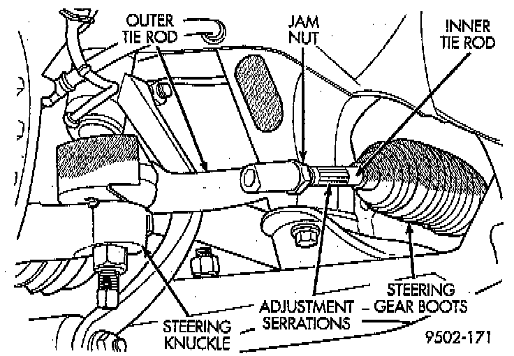 9. Adjust steering gear to tie rod boots at inner tie rod.