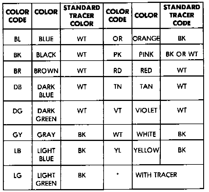 Each wire shown in the diagrams contains a code which identifies the main circuit, part of the main circuit, gauge of wire and color. The color is shown as a two-letter code, which can be identified by referring to the Wire Color Code chart.