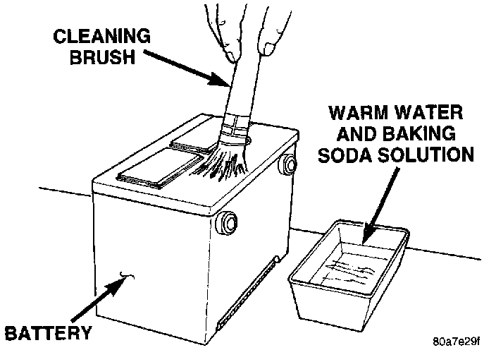 1. Clean battery with a solution of warm water and baking soda. Apply solution with a bristle brush and allow to soak until acid deposits loosen. Rinse with clear water and blot dry with paper toweling. Dispose of toweling in a safe manner. Refer to the WARNINGS on top of battery.