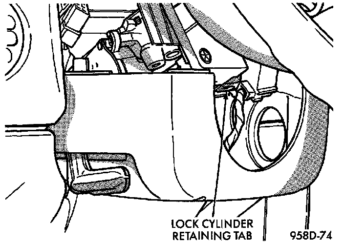 4. Place key cylinder in RUN position. Depress retaining tab and remove key cylinder.