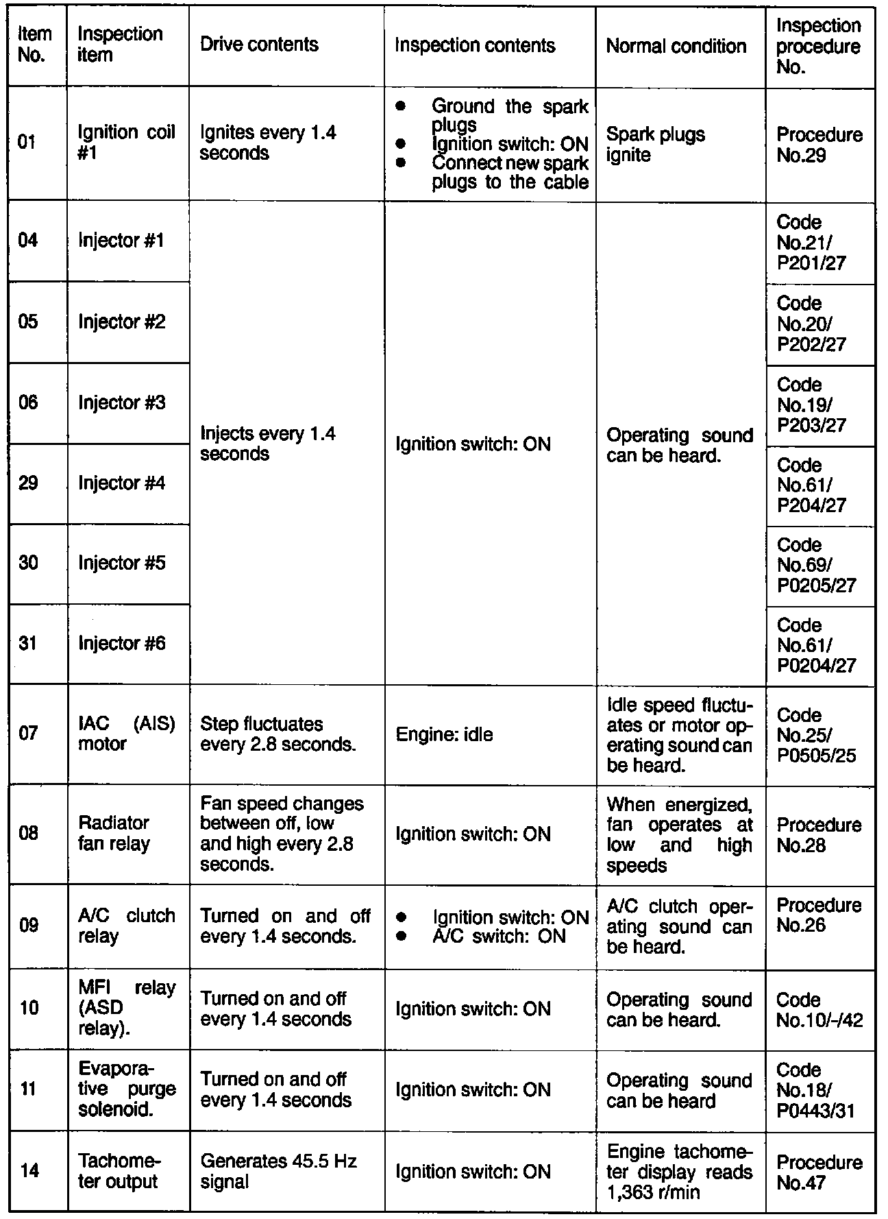 Actuator Test Reference Table: